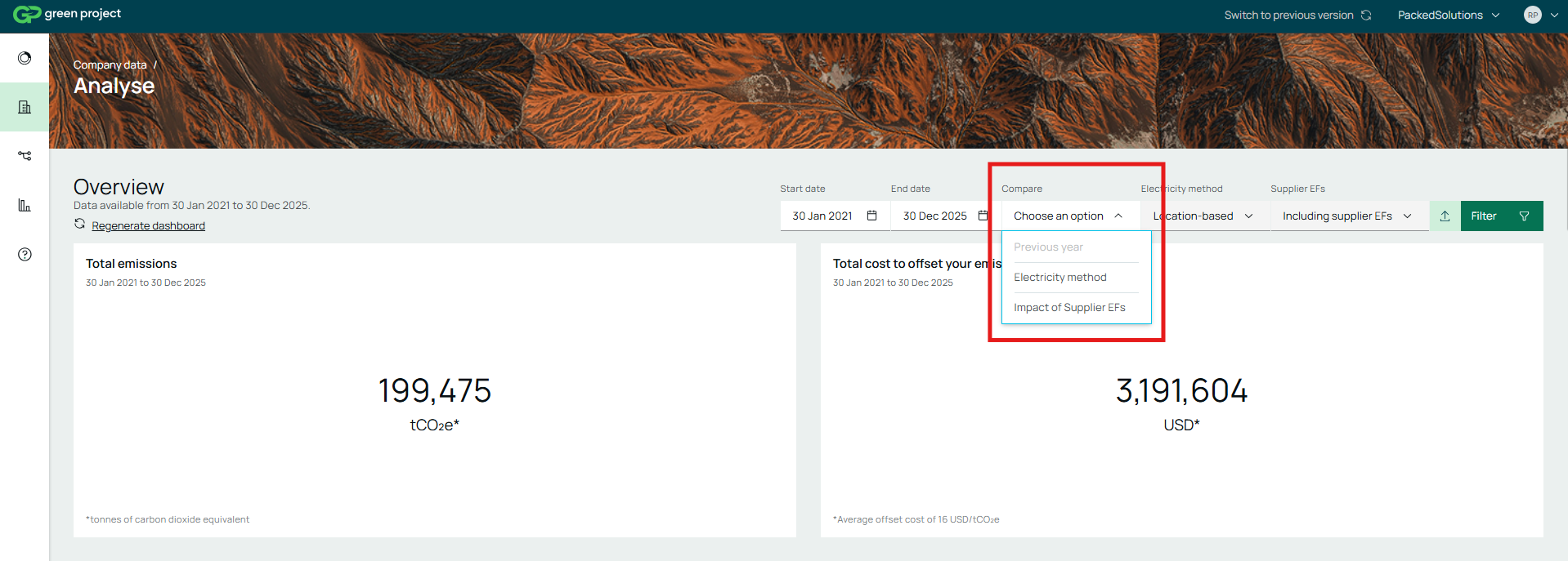 Green Project allows you to easily compare your current emissions data to past periods. Whether you want to see improvements year-over-year or identify trends, this feature provides side-by-side insights within your dashboard.
